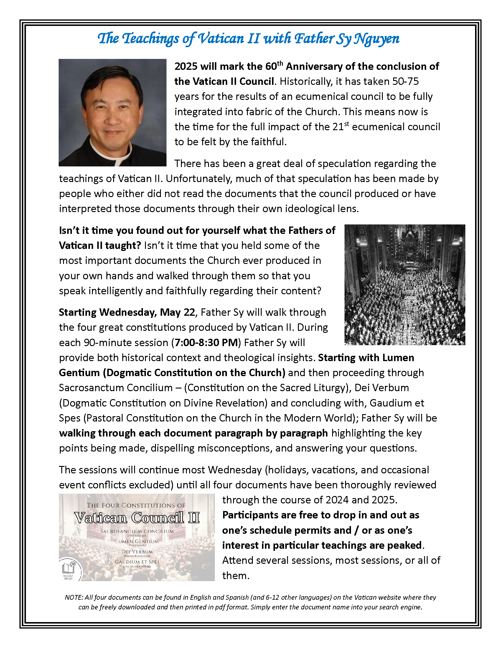 Weekly on Wednesdays - Father Sy Nguyen is leading a series of sessions where he will continue to walk through the four great constitutions produced by Vatican II, providing historical context and theological insights, and answering questions, with the sessions continuing until all four documents have been thoroughly reviewed. Wednesdays, 7:00-8:30 PM in Rooms 1&2 - start time may vary, stay up to date by joining the mailing list: cmorris@hforange.org